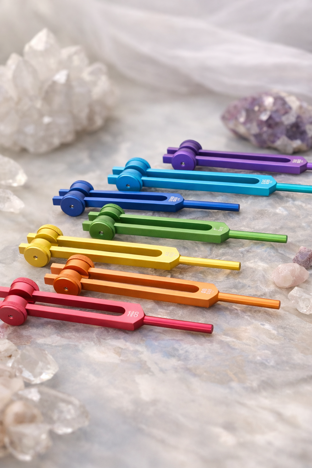 Each fork is tuned to a specific frequency associated with the seven primary chakras. Small crystal attachments are placed gently along the back of the body, allowing the frequencies to travel through the energetic field and into the physical body through vibration.